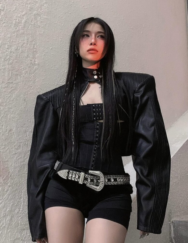Cô nàng phối áo corset ôm sát kết hợp cùng jacket da độn vai mạnh mẽ, tạo nên tỷ lệ hình thể bắt mắt. Điểm nhấn nằm ở chiếc thắt lưng đính đá bản to và phần cổ cao da đinh tán, gợi liên tưởng đến trang phục trình diễn sân khấu quốc tế.