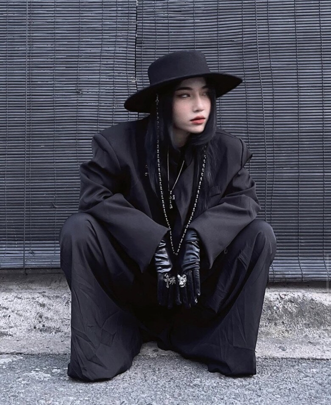 Với set đồ đen toàn tập mang cảm hứng dark western pha trộn avant-garde, LyHan tiếp tục chứng minh sự linh hoạt và chiều sâu trong phong cách thời trang cá nhân. Cô diện bộ suit oversized đi kèm mũ rộng vành, găng tay da và chuỗi phụ kiện dài mang sắc thái bí ẩn, lạnh lùng.