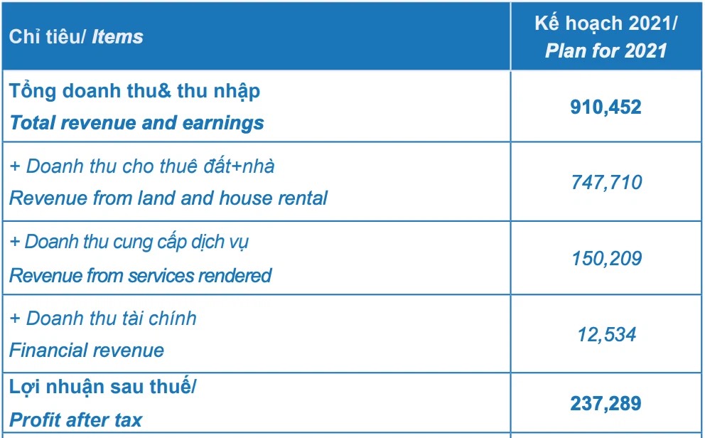 Trong đó, kỳ vọng doanh thu từ cho thuê đất và nhà gần 748 tỷ đồng, doanh thu từ cung cấp dịch vụ hơn 150 tỷ đồng và doanh thu tài chính gần 13 tỷ đồng.