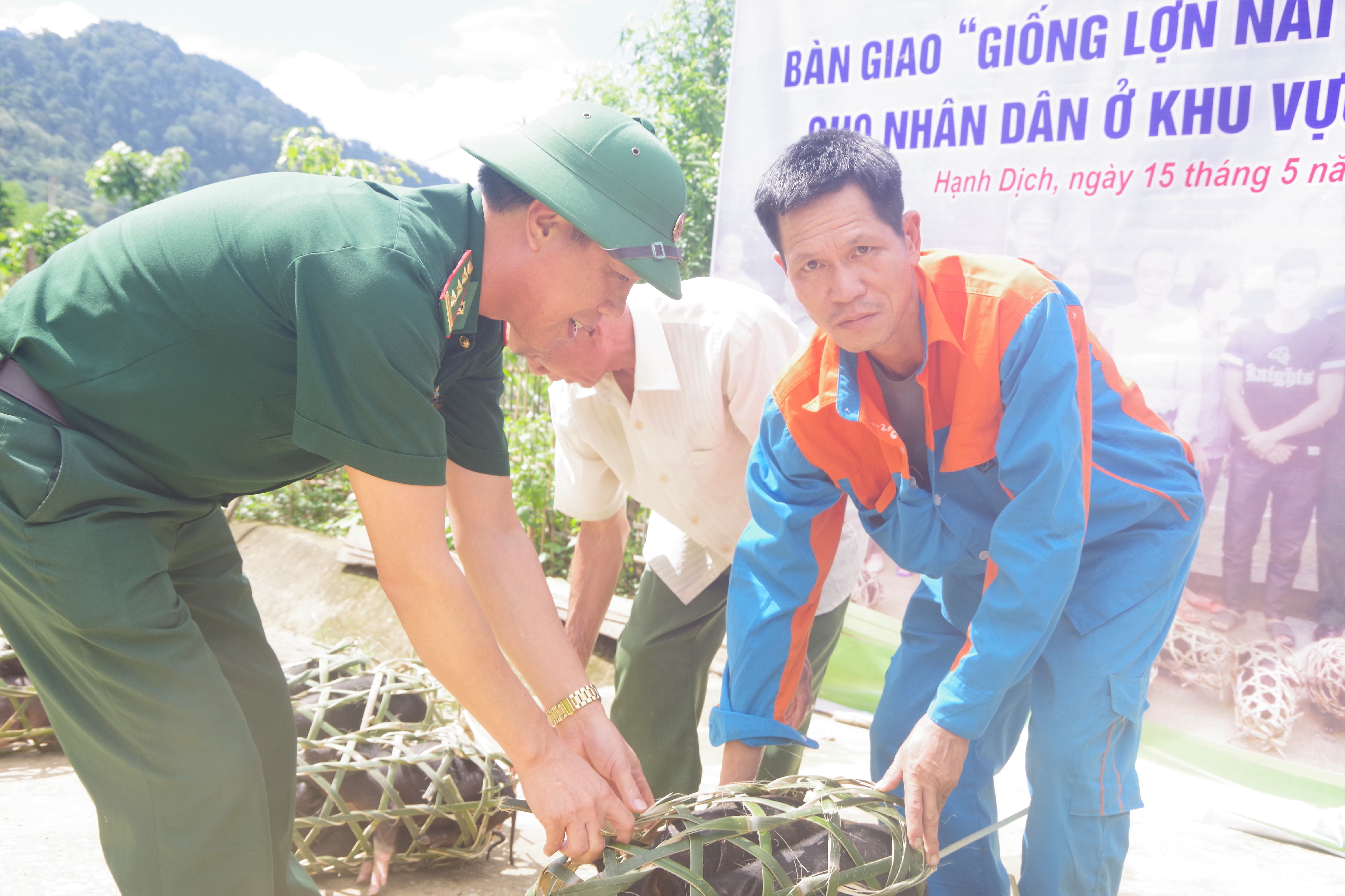 Tại buổi lễ, đã trao 35 con lợn giống có trọng lượng từ 10 – 15kg cho 7 hộ gia đình (mỗi hộ 5 con) có hoàn cảnh khó khăn của xã Hạnh Dịch, huyện Quế Phong. Đây là số lợn giống do cán bộ chiến sỹ đơn vị tổ chức nuôi dưỡng, chăm sóc phù hợp với khí hậu và điều kiện chăn nuôi của người dân địa phương.
