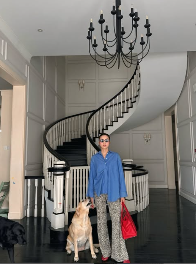 Chụp ảnh "sống ảo" với background là góc cầu thang quen thuộc tại căn biệt thự, Hà Tăng diện trang phục ngầu đét gồm áo sơ mi phối quần ống loe da báo, đeo kính râm cực ngầu.