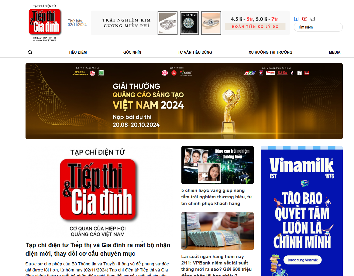 Tạp chí điện tử Tiếp thị và Gia đình với tên miền https://tiepthigiadinh.vn/ (Trụ sở đóng tại số 8 Phan Văn Trường, phường Dịch Vọng Hậu, quận Cầu Giấy, TP Hà Nội) - là cơ quan ngôn luận của Hiệp hội Quảng cáo Việt Nam. Tạp chí được Bộ Thông tin và Truyền thông cấp phép hoạt động Tạp chí điện tử số 319/GP-BTTTT ngày 30/10/2024.