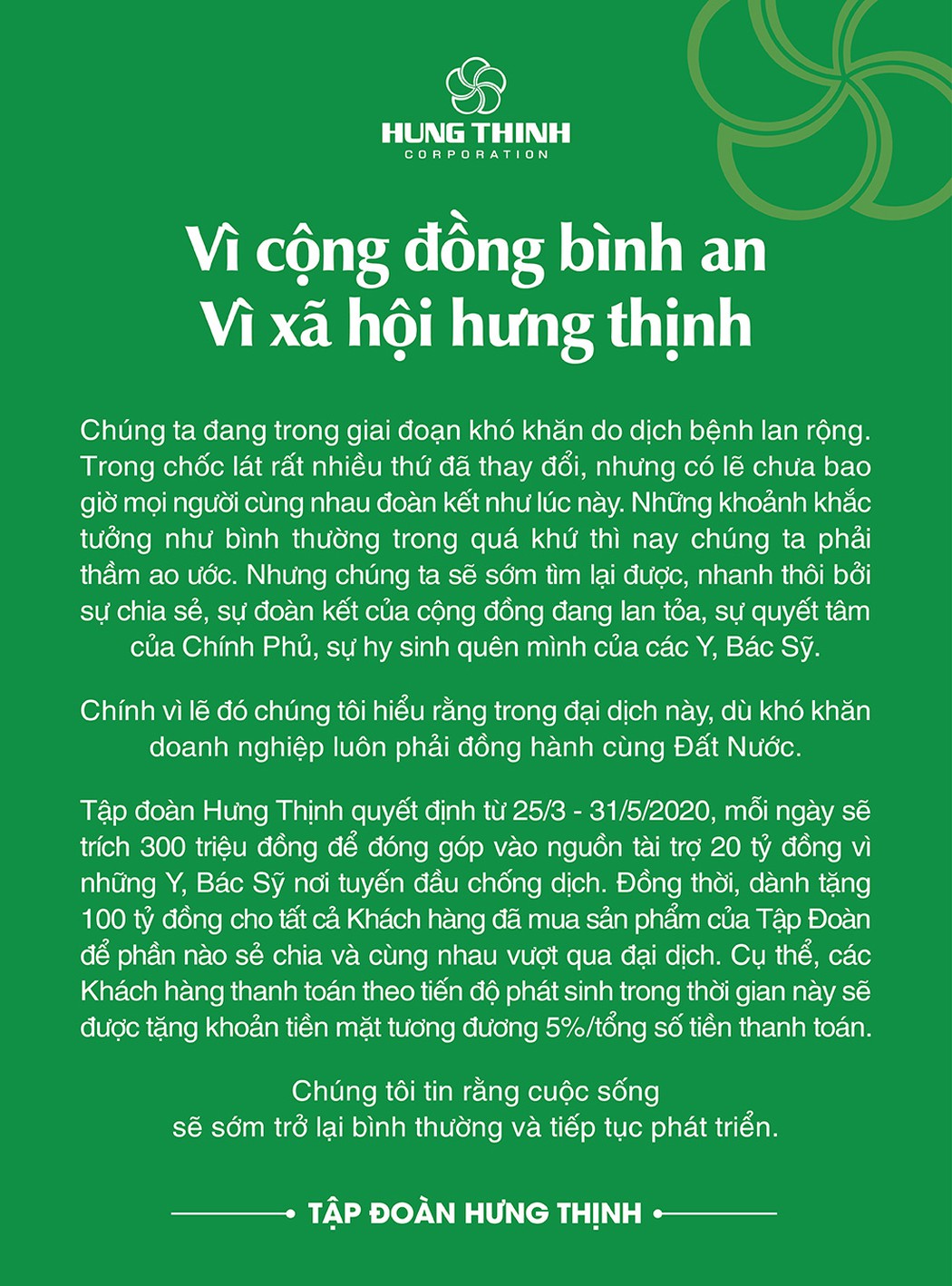 Trước đó, tại lễ phát động toàn dân ủng hộ phòng chống dịch Covid-19 tại UBTƯ MTTQ Việt Nam vừa được tổ chức ngày 17/3/2020, đại diện Tập đoàn Hưng Thịnh đã trao 5 tỷ đồng ủng hộ nhằm góp phần ứng phó, giảm thiểu thiệt hại từ bệnh dịch đối với cộng đồng. Nguồn kinh phí trên một phần do cán bộ, nhân viên chung tay đóng góp, phần còn lại được trích từ ngân sách của Tập đoàn. Đây là hành động thiết thực, không chỉ thể hiện tinh thần quyết tâm chống dịch mà còn là trách nhiệm đối với cộng đồng - xã hội của Ban lãnh đạo cũng như toàn thể cán bộ, nhân viên Tập đoàn.