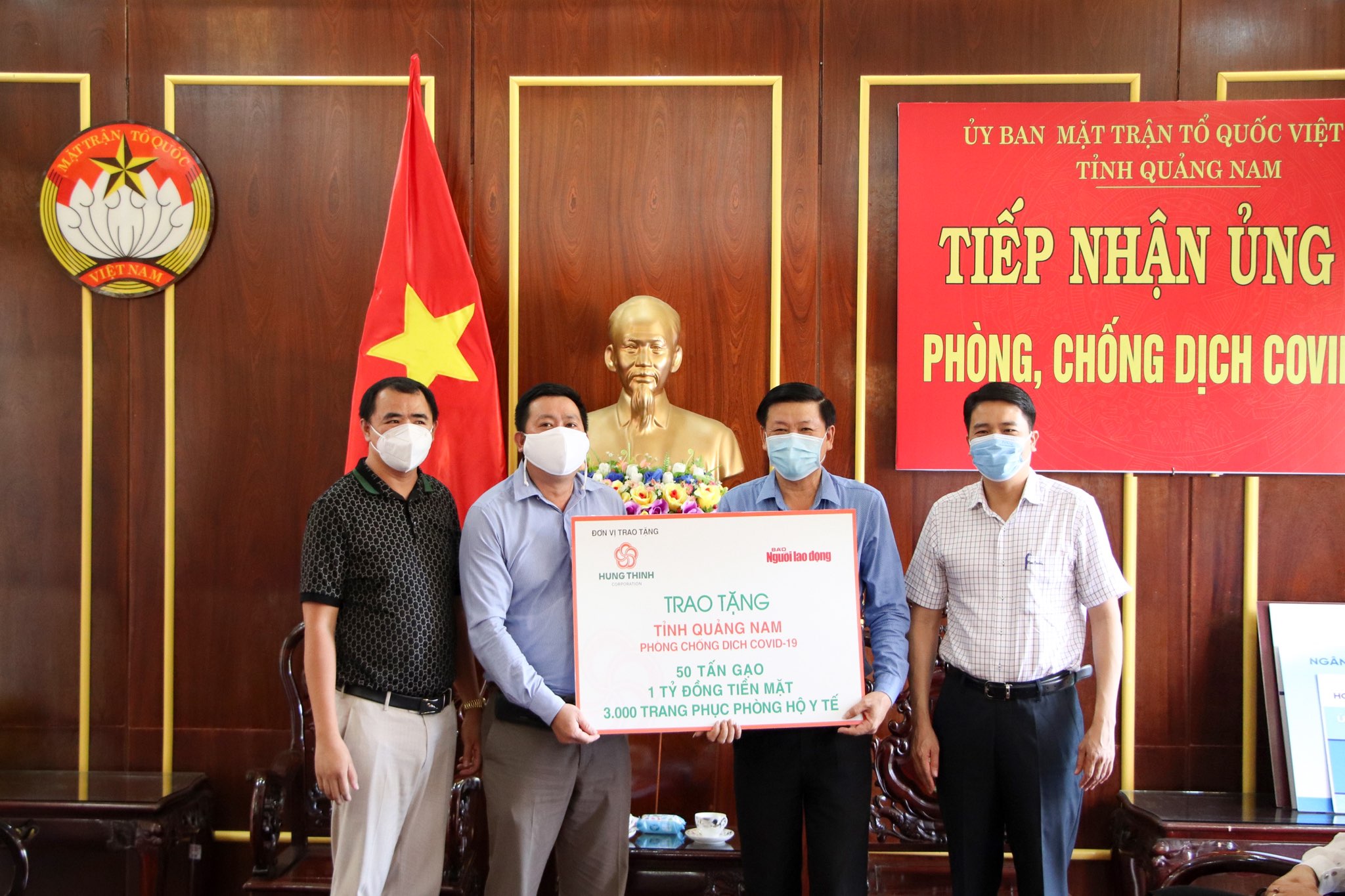 Thông qua báo Người Lao động, ông Phạm Thanh Hùng - Phó Chủ tịch HĐQT kiêm Phó Tổng Giám đốc Tập đoàn Hưng Thịnh trao bảng tượng trưng cho bà Nguyễn Thị Bạch Mai – Phó Trưởng ban thường trực Ban Dân vận Thành ủy TP.HCM nhằm hỗ trợ tỉnh Quảng Nam phòng chống dịch Covid-19