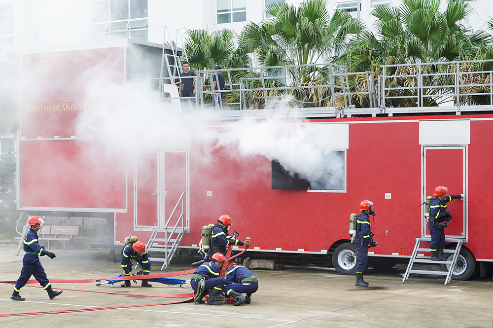 Các chiến sĩ cảnh sát PCCC diễn tập tình huống PCCC và cứu nạn, cứu hộ với các trang thiết bị mà Tập đoàn Hưng Thịnh vừa trao tặng