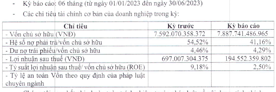 Tại thời điểm 30/6/2023, hệ số nợ phải trả/vốn chủ sở hữu là 41,16%, dư nợ trái phiếu/vốn chủ sở hữu là 4,29%, tương đương với nợ trái phiếu hơn 338 tỷ đồng.