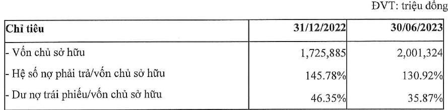 Tính tới ngày 30/6/2023, Công ty có vốn chủ sở hữu hơn 2.001 tỷ đồng; tăng 16% so với cuối năm ngoái. Hệ số nợ phải trả/vốn chủ sở hữu 130,92%, tương ứng số dư nợ phải trả ở mức hơn 2.620 tỷ đồng. Trong đó dư nợ trái phiếu/vốn chủ 35,87%, tương ứng nợ trái phiếu ở mức 717,8 tỷ đồng.