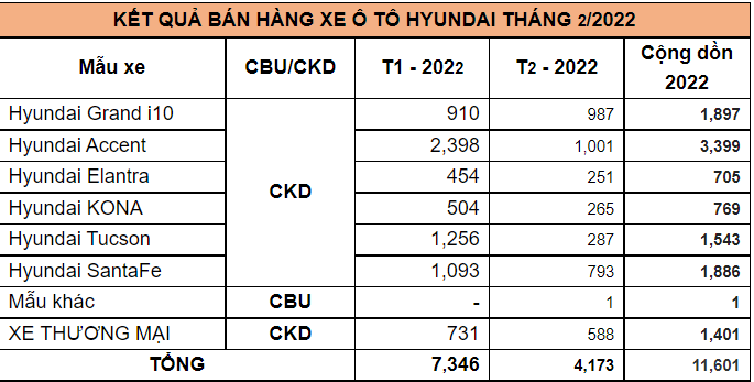 Thời điểm tháng 2 vào đúng dịp Tết Nguyên Đán đãn đến sự sụt giảm chung của toàn thị trường, thương hiệu Hyundai cũng không nằm ngoài quy luật chung này. Tuy nhiên so với cùng kì năm 2021, số lượng xe bán ra của Hyundai vẫn tăng trưởng hơn 38,1%, đạt 4.173 xe so với 3.021 xe của tháng 2 năm 2021.