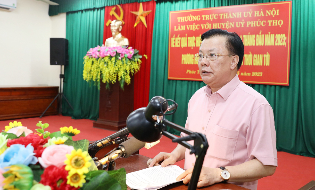 Phát biểu kết luận cuộc làm việc, Bí thư Thành ủy Đinh Tiến Dũng ghi nhận, biểu dương, đánh giá cao Đảng bộ, chính quyền và nhân dân huyện Phúc Thọ đã khắc phục khó khăn, vượt qua thách thức, nỗ lực thực hiện các nhiệm vụ chính trị, bước đầu có kết quả tích cực trên các lĩnh vực; một số lĩnh vực chuyển biến rõ nét. Tuy nhiên, nhìn chung, kinh tế - xã hội huyện phát triển chưa tương xứng với tiềm năng và vị trí trung tâm vùng.
