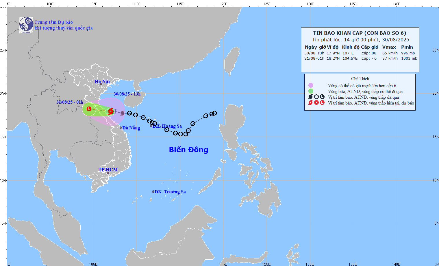 Sáng 30/8, Trung tâm Dự báo Khí tượng Thủy văn quốc gia ghi nhận bão số 6 hình thành trên Biển Đông, cường độ gió mạnh cấp 8 (62–74 km/h), giật cấp 10–11, di chuyển với tốc độ 20–25 km/giờ theo hướng Tây Tây Bắc. Đến 10h cùng ngày, tâm bão nằm trên vùng biển Hà Tĩnh – Quảng Trị, cách đất liền khoảng 200 km. Dự báo chiều tối, bão sẽ đi vào khu vực từ nam Hà Tĩnh đến bắc Quảng Trị, gây gió mạnh cấp 6–7, vùng gần tâm bão cấp 8, giật cấp 9–10.