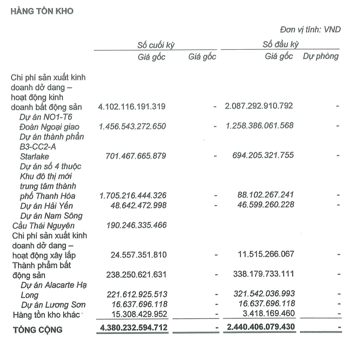 Tính tới ngày 30/9, Taseco Land ghi nhận tồn kho hơn 4.380 tỷ đồng, cao gấp 1,8 lần đầu năm và chiếm 44% trong tổng tài sản, phần lớn tại các dự án bất động sản dở dang. Trong đó, tồn kho lớn nhất là tại dự án số 4 thuộc khu đô thị mới trung tâm TP Thanh Hóa (1.705 tỷ đồng), Dự án NO1T6 Đoàn Ngoại giao (1.456 tỷ đồng) và Dự án thành phần B3CC2A Starlake (701 tỷ đồng).