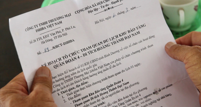 Khi gặp ông Tú, người của công ty này mang theo bản kế hoạch chi tiết tổ chức tham quan du lịch gồm Khu bảo tàng Quân đoàn 4 và Đại Nam (tỉnh Bình Dương). Xem xong, ông Tú thấy nhiều điểm không rõ ràng nên không đồng ý ký giấy giới thiệu cho công ty về các xã chào mời. “Lúc này, một nhân viên công ty chìa cho tôi một phong bì và cố tình để tôi thấy có xấp tiền bên trong. Khi tôi đề nghị người này cất tiền, nếu không sẽ gọi báo công an thì những người này rút lại và bỏ đi. Tưởng họ sẽ không tổ chức nữa, ai dè họ lặng lẽ đến xã Thành Long “dụ dỗ” chủ tịch Hội người cao tuổi xã này đứng ra ngấm ngầm tổ chức cho 170 người dân thuộc 3 xã Thành Long, Hòa Hội và Hòa Thạnh. Ngày 5.5.2019, công ty này đưa 6 ô tô đến đón người dân đưa sang Bình Dương tham quan”, ông Tú kể.
