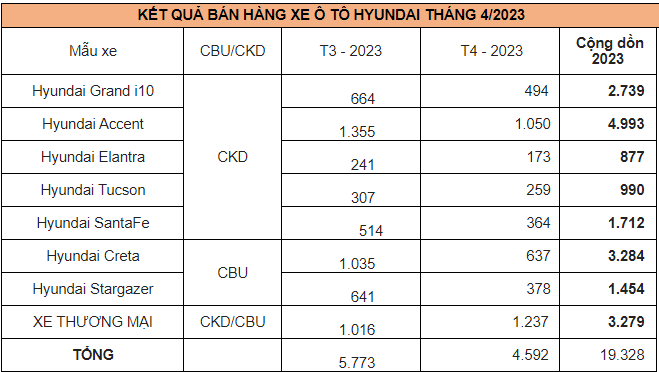 Ngày 11/05, Tập đoàn Thành Công (TC GROUP) thông báo kết quả bán hàng tháng 4/2023. Theo đó, tổng doanh số xe Hyundai tháng 4 đạt 4.592 xe.