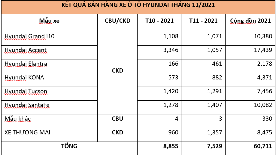 Hyundai Elantra và KONA chứng kiến sự tăng trưởng vượt bậc so với tháng 10, với con số tăng trưởng của Elantra đạt 177%, tương ứng 461 xe & KONA đạt 53%, tương ứng 882 xe. Hyundai Accent với số bán ra tháng 11 đạt 1.057 xe giúp tổng doanh số trong năm 2021 đạt 17.439 xe, giữ vững vị trí số 1 về doanh số bán của Hyundai trong năm 2021.