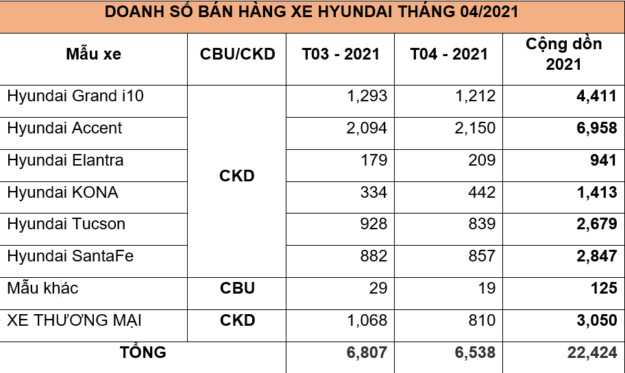 Ngày 11/05/2021, TC MOTOR công bố kết quả bán hàng tháng 04/2021. Theo đó, tổng doanh số xe Hyundai tháng 4 đạt 6.538 xe, cộng dồn 22.424 xe 4 tháng đầu năm.