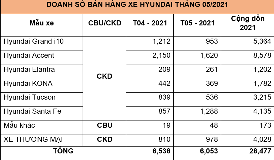 Ngày 10/06/2021, TC MOTOR công bố kết quả bán hàng tháng 05/2021. Theo đó, tổng doanh số xe Hyundai tháng 5 đạt 6.053 xe, cộng dồn 28.477 xe 5 tháng đầu năm.