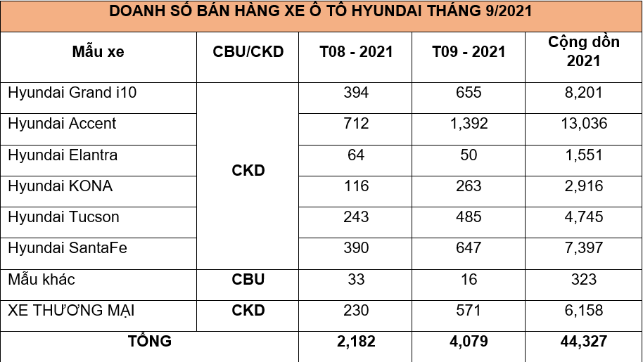 Ngày 11/10, TC MOTOR công bố kết quả bán hàng tháng 09/2021. Theo đó, tổng doanh số xe Hyundai tháng 9 đạt 4.079 xe, cộng dồn 44.327 xe tính từ đầu năm 2021.