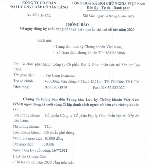 CTCP Đại lý Giao nhận vận tải Xếp dỡ Tân Cảng (MCK: TCL) cho biết, ngày 16/7 tới đây sẽ chốt danh sách cổ đông trả cổ tức năm 2020.