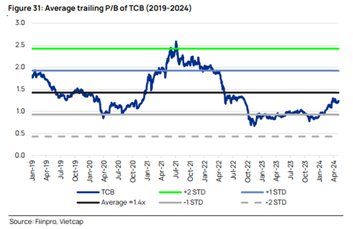 Tại báo cáo phân tích mới công bố, Chứng khoán KB (KBSV) cũng dự báo tăng trưởng tín dụng của Techcombank sẽ tiếp tục được dẫn dắt nhờ sự phục hồi của thị trường bất động sản. Bên cạnh đó, KBSV cho rằng tỷ lệ CASA sẽ tạo thêm dư địa để Techcombank tiếp tục kiểm soát chi phí vốn và NIM hồi phục trước khi lãi suất huy động tăng trở lại.