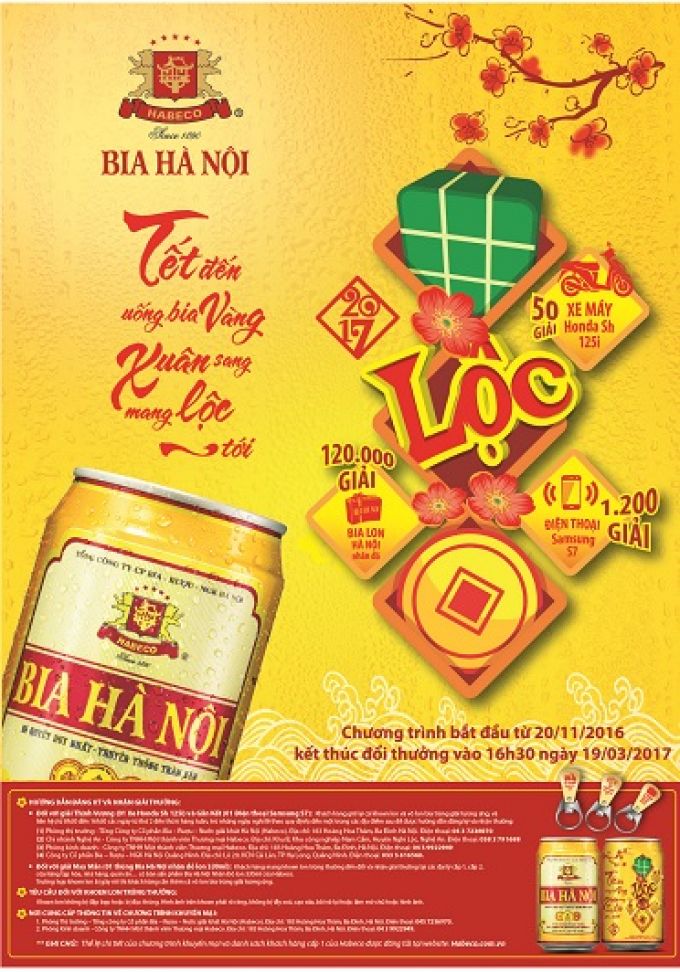 Tổng công ty Cổ phần Bia – Rượu – Nước giải khát Hà Nội (Habeco) vừa tổ chức Lễ công bố Chương trình khuyến mại bia lon Hà Nội Tết 2017. Chủ đề của chương trình khuyến mại năm nay là “Tết đến uống bia vàng – Xuân sang mang lộc tới”.