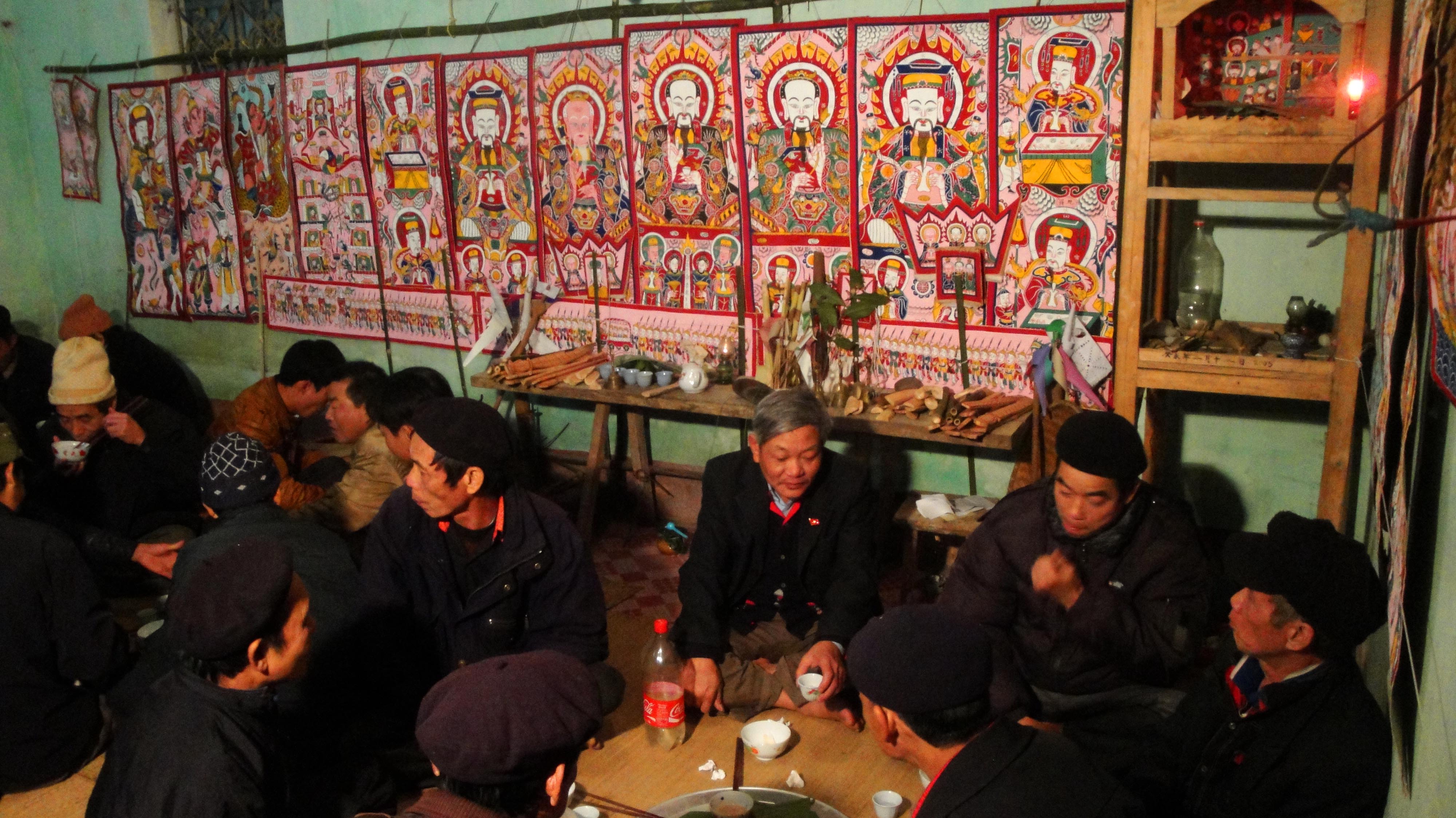 Mọi thứ đã được chuẩn bị đủ đầy, gia chủ bày biện hơn chục mâm cỗ từ nhà ra sân để khao họ hàng, làng xóm. Chẳng có sơn hào hải vị mà chỉ có thịt lợn vun đầy mâm, rượu ủ men lá nhưng khi nhấp chén rượu cùng bà con nơi đây mới cảm nhận được sự hiếu khách và lòng thành kính với tổ tiên. Sau bữa rượu thịt đầu tiên, hai bộ Tam thanh với nhiều màu sắc, nét vẽ các thần linh kỳ bí và dữ tợn được treo lên vách nhà. Những bức tranh kỳ bí này không phải ai cũng biết và hiểu về nó, duy chỉ có thầy mo là người tường tận nhất. 15 bức tranh là những câu chuyện bằng hình ảnh trong thế giới tâm linh của người Dao. Thầy mo Thành chỉ vào 1 bức tranh và nói: “Ví dụ như bức này muốn dăn dạy mọi người sống phải “tốt cái bụng”. Nếu sống ác khi chết đi sẽ bị trừng phạt như: ném vào vạc dầu, bị quỷ thần dùng cưa cắt đôi thân người, qua cầu bị rắn rết lôi xuống sông”.