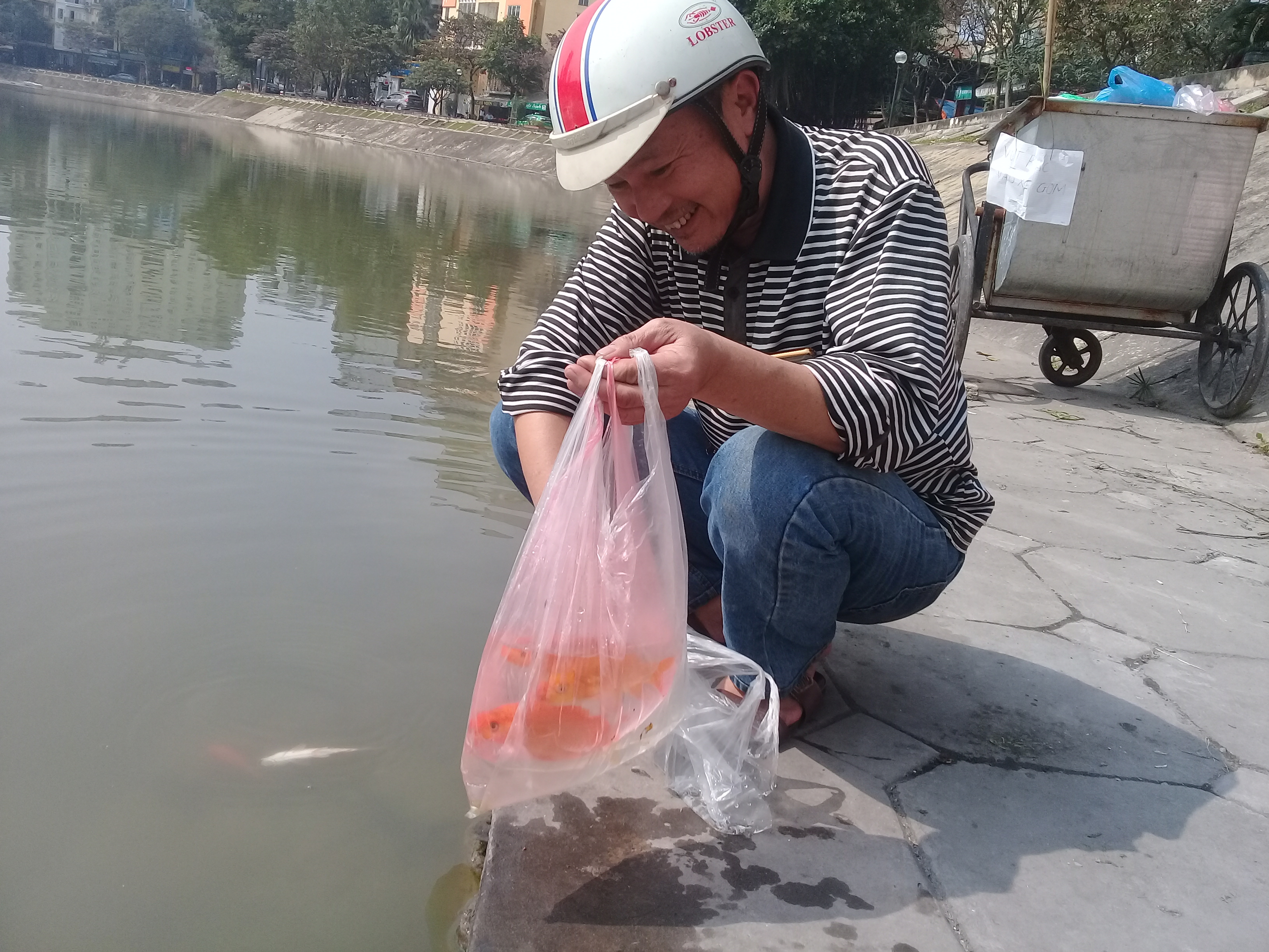 Chị Nguyễn Thu Hằng (Ba Đình, Hà Nội) chia sẻ: "Năm nào cũng thế, sau khi cúng ông Táo xong, nhà tôi cũng mang cá ra hồ gần nhà để phóng sinh. Năm nay, tôi đưa cả con trai 8 tuổi đi cùng để cháu hiểu hơn về ý nghĩa của phong tục tốt đẹp này. Tôi cũng thấy rất mừng vì mọi người đi thả cá xong đều vứt túi vào thùng rác, tôi cũng chưa thấy ai mang tro đổ ra hồ như mấy năm trước nữa."