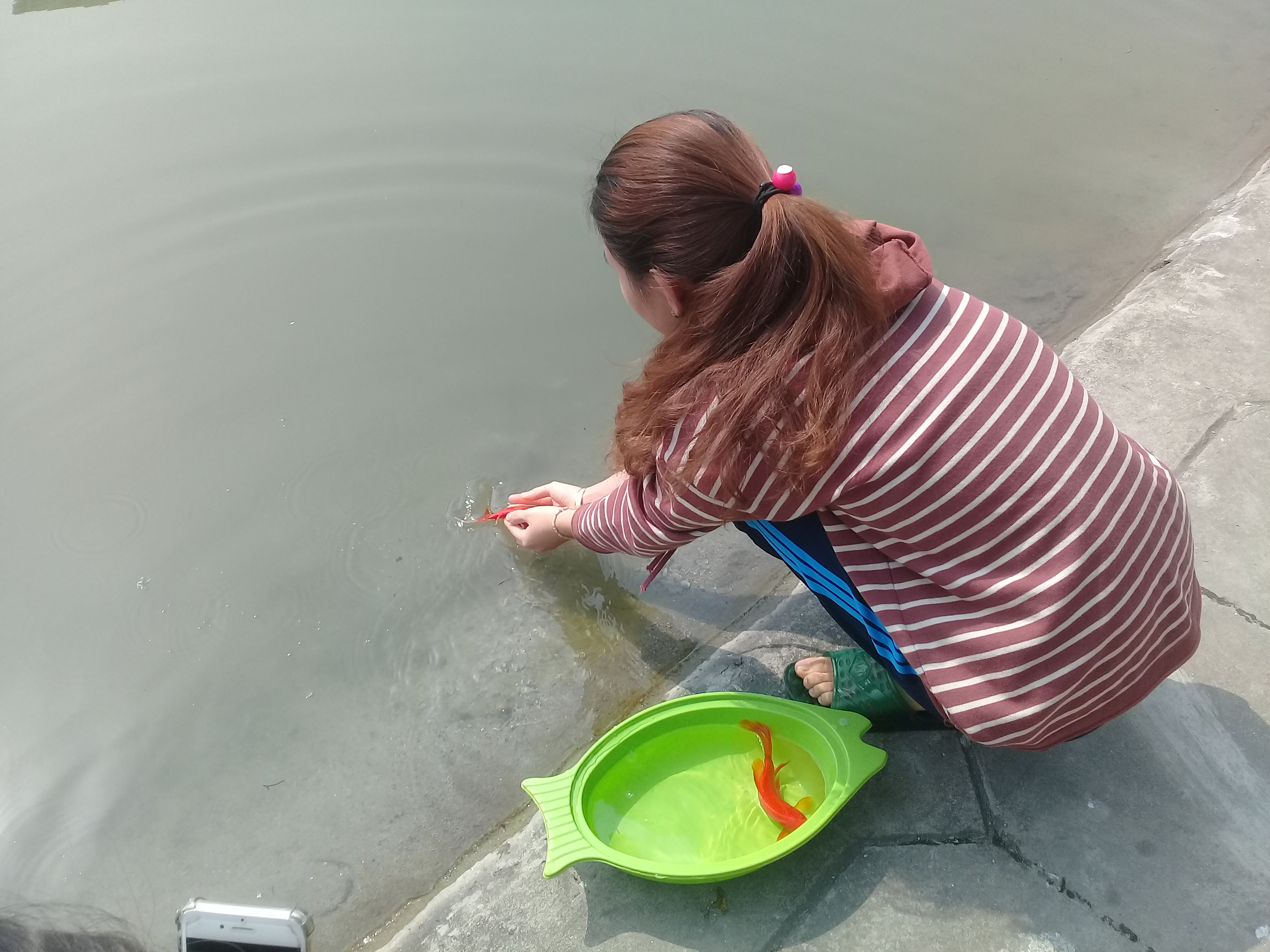 | Một cô gái nhẹ nhàng thả từng chú cá chép xuống hồ Ngọc Khánh |