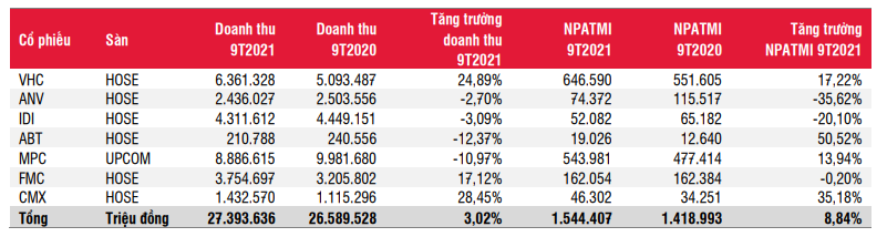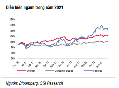 Năm 2021, chỉ số cổ phiếu nhóm ngành thủy sản tăng 54,3% so với đầu năm, cao hơn so với chỉ số VNIndex +20,5% so với đầu năm. Các doanh nghiệp có hiệu quả tốt nhất gồm IDI (+98%), FMC (+58%), VHC (+56%), MPC (+53%), ANV (+41%) và CMX (+22%). Các doanh nghiệp doanh nghiệp xuất khẩu tôm và cá tra đều công bố kết quả đáng khích lệ kể từ Q2/2021 và có dấu hiệu phục hồi mạnh mẽ (giá phục hồi trong năm 2022) trong Q3/2021, khi hầu hết các cổ phiếu được định giá lại và đạt hiệu suất tốt hơn chỉ số VNIndex.