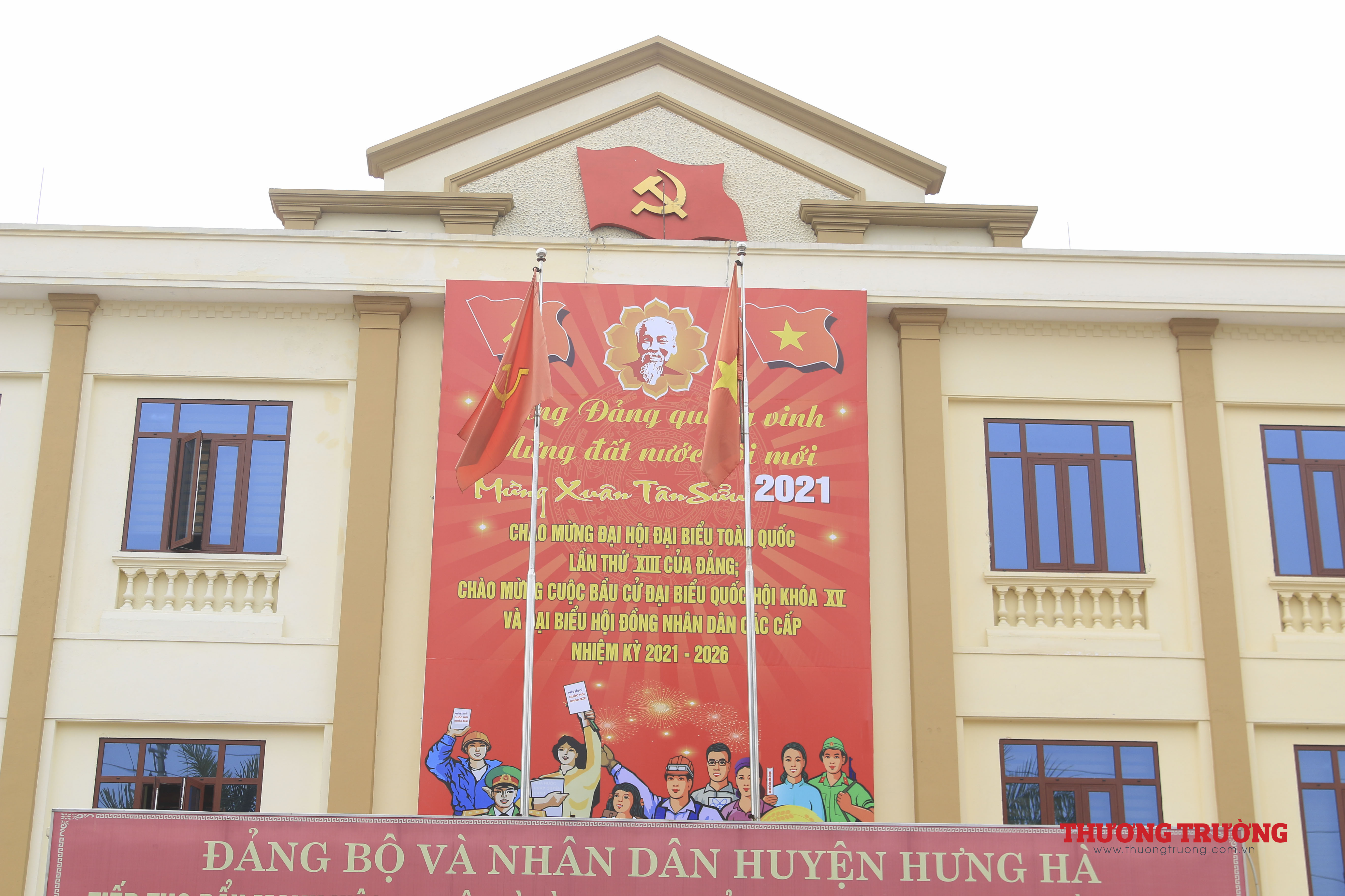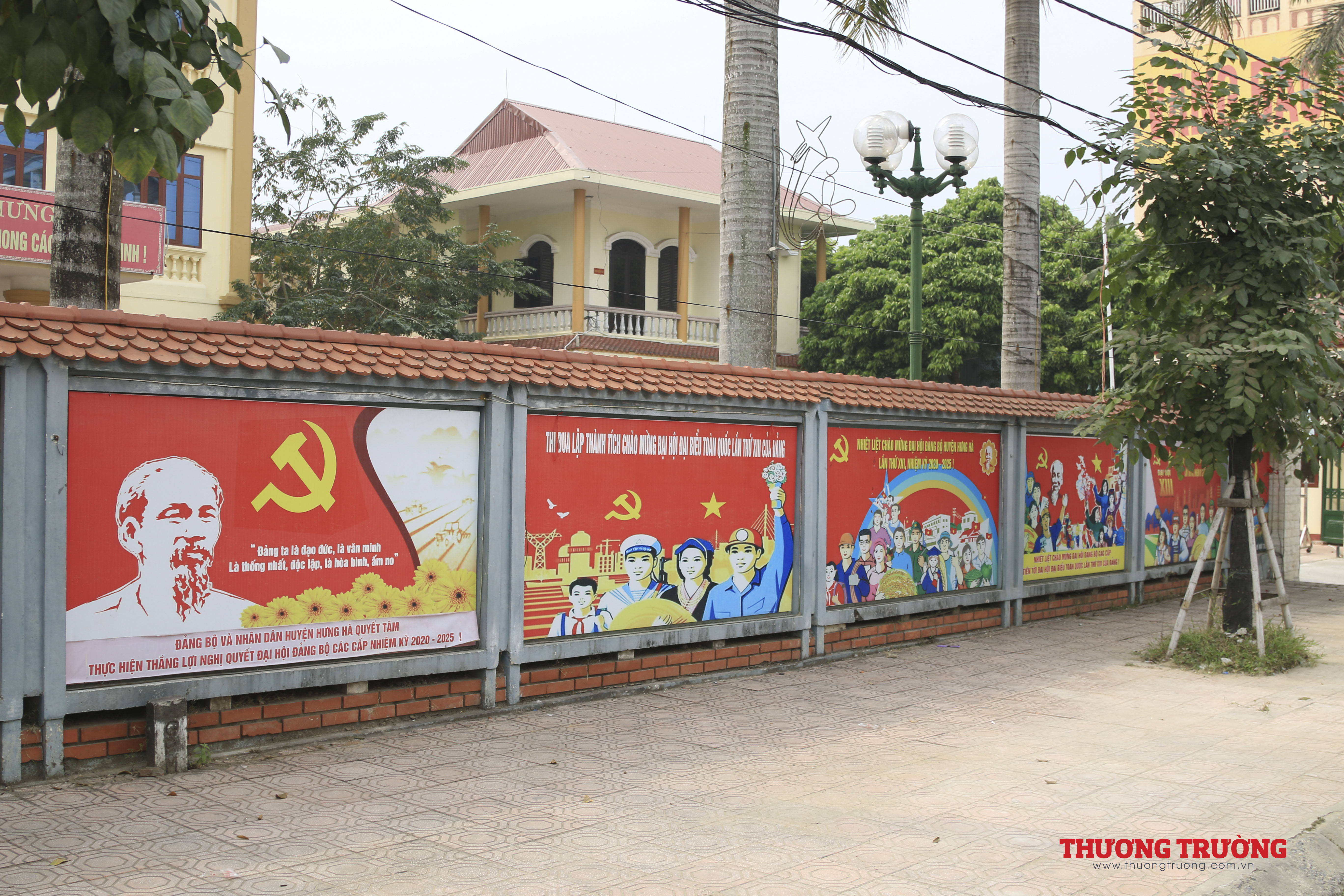 Băng rôn, khẩu hiệu, cờ Đảng, cờ Tổ quốc được trang trí tại huyện Hưng Hà.