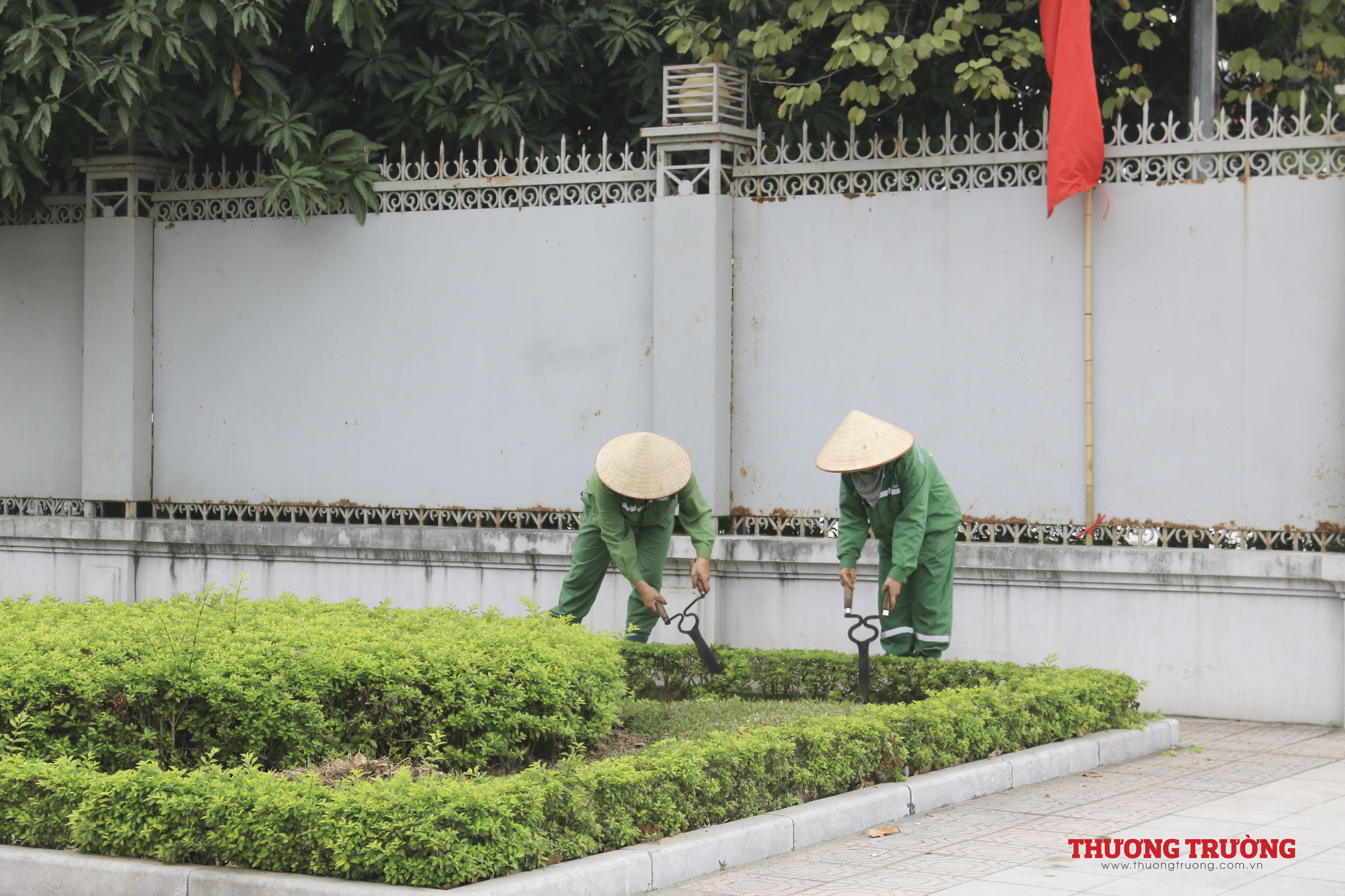 Các công nhân đang tích cực cắt tỉa, chỉnh trang lại vườn hoa đường phố.