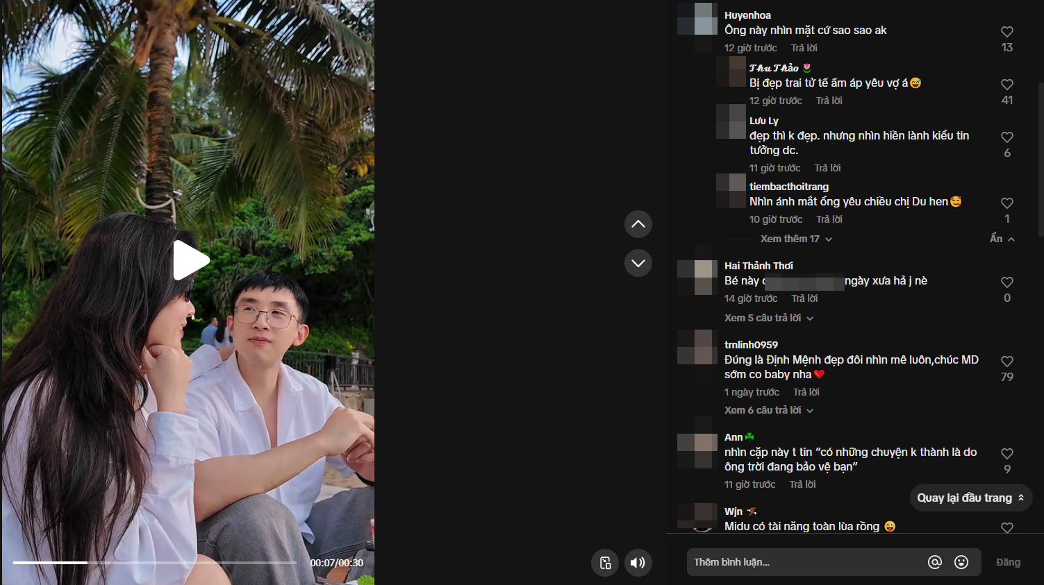 Video liên quan đến vợ chồng Midu đang nhận về hơn 400 nghìn lượt xem cùng 23 nghìn lượt cảm xúc, bình luận.