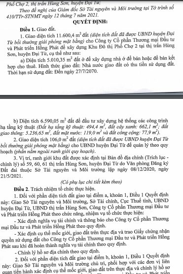 Theo quyết định mới ban hành, UBND tỉnh Thái Nguyên giao diện tích 11.600,4 m2 đất đã được UBND huyện Đại Từ bồi thường giải phóng mặt bằng cho CTCP Thương mại Đầu tư và Phát triển Hồng Phát để xây dựng Khu đô thị Phố Chợ 2 tại thị trấn Hùng Sơn, huyện Đại Từ.