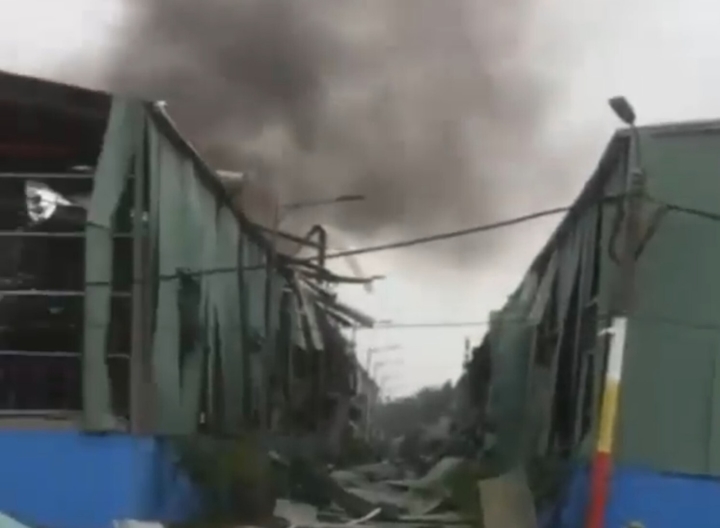 Vụ nổ khiến khu nhà xưởng hư hỏng nặng, nhiều miếng tôn, thanh sắt vây quanh nhà xưởng văng rải rác trên mặt đất.