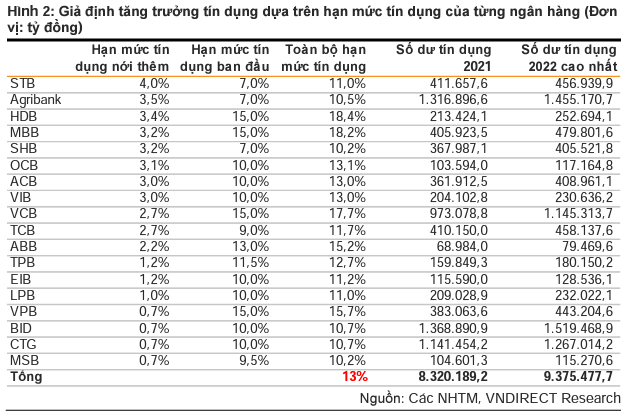 Theo ước tính của VnDirect, với hạn mức tín dụng mới, tổng tăng trưởng tín dụng sẽ đạt khoảng 13% vào cuối năm – tiệm cận với mục tiêu 14% của NHNN (lưu ý rằng 20% thị phần tín dụng còn lại không được phản ánh trong tính toán của VND). Vì vậy, với mục tiêu hàng đầu là kiểm soát lạm phát và ổn định vĩ mô hiện nay, VnDirect thấy cơ hội để có thêm một đợt tăng hạn mức tín dụng nữa từ giờ cho đến hết năm là khá hạn chế.