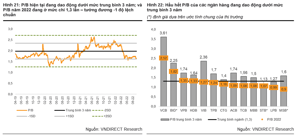 Đợt điều chỉnh gần đây của thị trường đã đưa định giá ngành ngân hàng xuống mức hấp dẫn với 1,3 lần P/B 2022, thấp hơn 35% so với mức trung bình 3 năm là 2,0 lần. Những lo ngại của thị trường về lạm phát và nợ xấu gia tăng đã làm ảnh hưởng đến tâm lý của các nhà đầu tư đối với triển vọng ngành ngân hàng kể từ đầu năm.