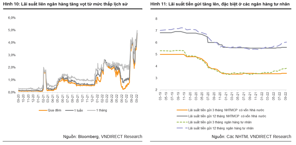 VnDirect kỳ vọng lãi suất liên ngân hàng sẽ hạ nhiệt trong những tuần tới, nhưng lãi suất qua đêm vẫn dao động ở mức cao 4-5% do đợt tăng mạnh gần đây của USD có thể đã phản ứng quá mức trước thông tin tăng lãi suất của Fed và có thể giảm sau đó; áp lực tỷ giá hạ nhiệt, cùng với các động thái hỗ trợ gần đây của NHNN như việc bơm ròng ra thị trường trong những phiên đầu tháng 9 sẽ góp phần hạ nhiệt lãi suất trên thị trường liên ngân hàng.