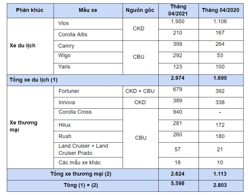 Tháng 04/2021, tổng lượng xe lắp ráp trong nước đạt 3.162 xe, chiếm hơn 56% doanh số Toyota Việt Nam. Doanh số các mẫu xe nhập khẩu của Toyota đạt 2.436 xe.