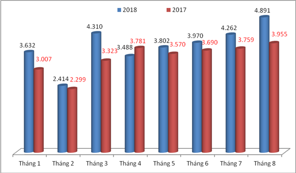 So với tháng 7/2018, kim ngạch xuất khẩu sang Hoa Kỳ tăng gần 15%. Trong khi đó so với tháng 8/2017, kim ngạch còn tăng cao hơn tới gần 24%.