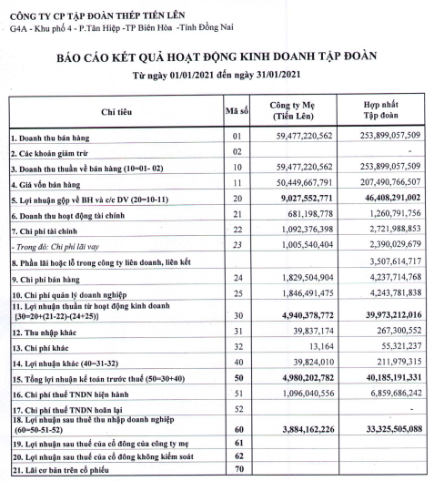 Theo đó, tháng 1/2021, doanh thu thuần của TLH đạt gần 254 tỷ đồng. Trong khi đó, giá vốn bán hàng đạt gần 207.5 nên lợi nhuận gộp đạt 46.6 tỷ đồng.