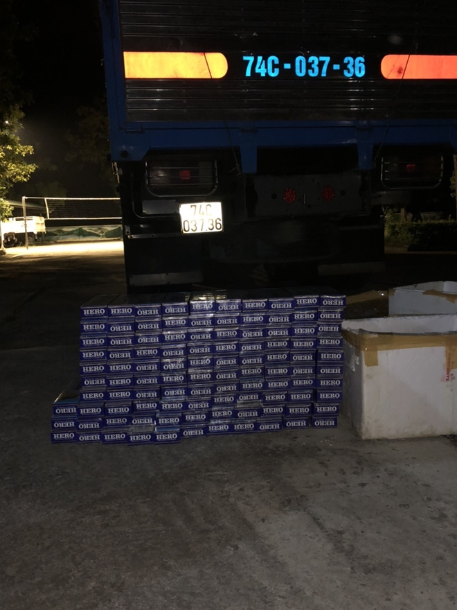 Qua kiểm tra, lực lượng chức năng phát hiện trên xe tải chở 103 cây thuốc lá (1.030 bao) do nước ngoài sản xuất nhãn hiệu Hero.
