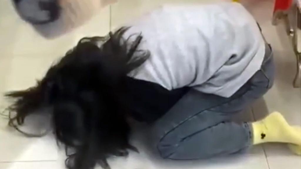 Nữ sinh bị làm nhục quỳ xuống sàn xin tha thứ. Ảnh từ clip