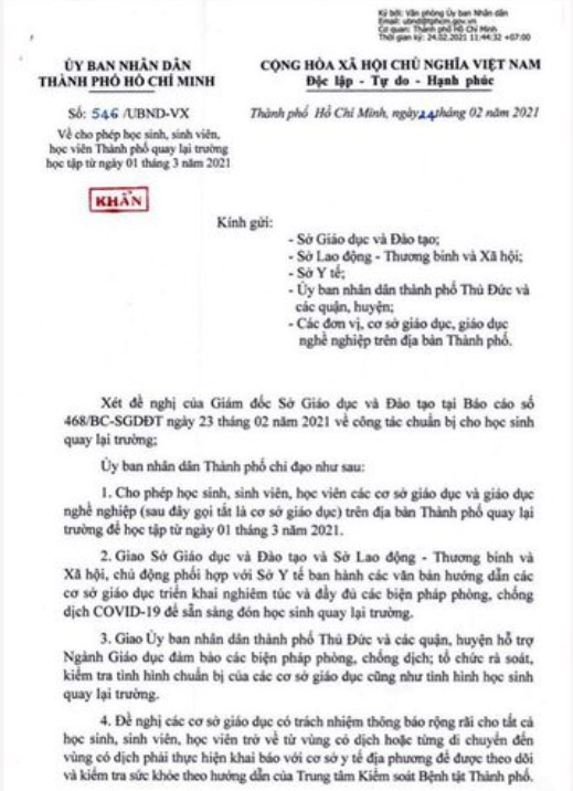 Văn bản khẩn, Thành phố HCM ra thông báo cho phép học sinh, sinh viên đi học trở lại từ 1/3
