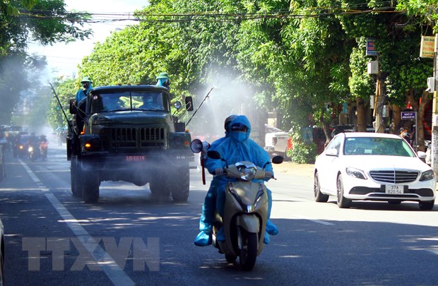 Nghệ An phun hóa chất khử khuẩn tại phường Hà Huy Tập sau khi phát hiện ca mắc COVID-19 đầu tiên. (Ảnh: Tá Chuyên/TTXVN)