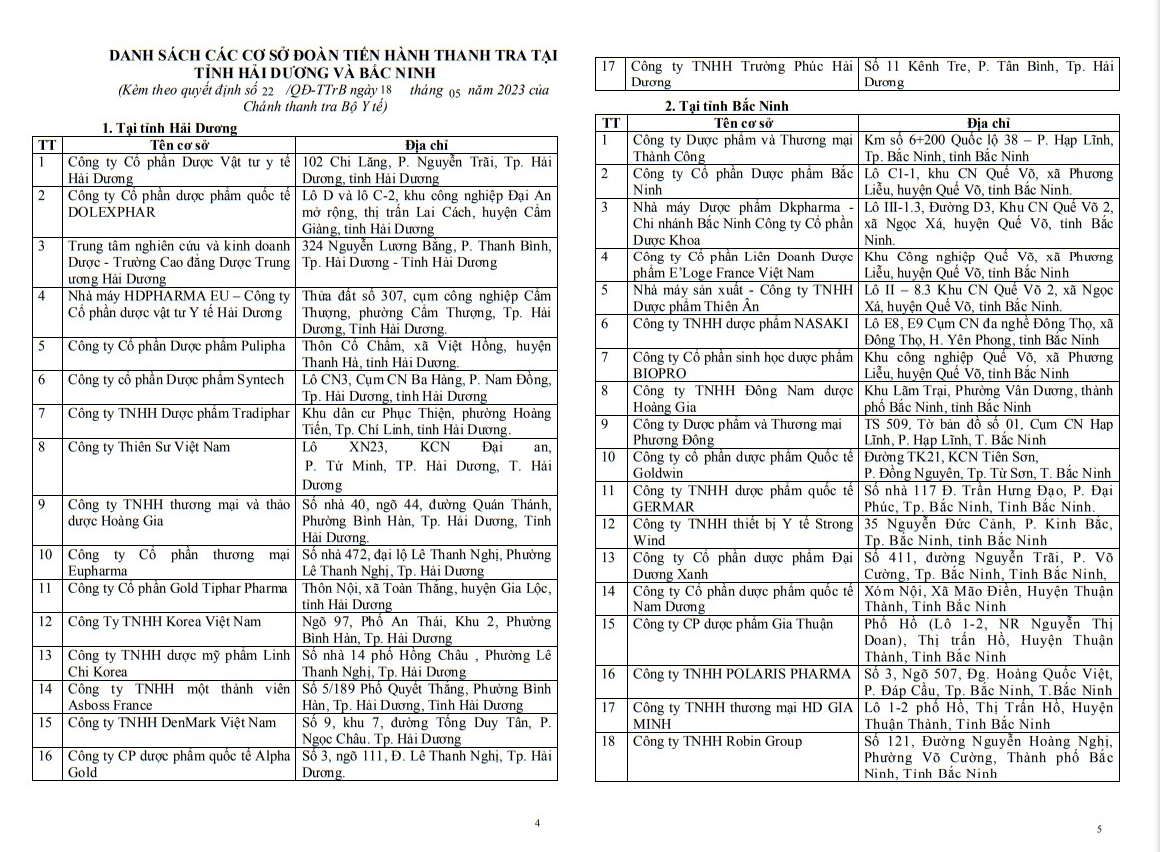 Đoàn thanh tra có nhiệm vụ thanh tra việc thực hiện các quy định của pháp luật về an toàn thực phẩm, phòng chống gian lận thương mại, hàng giả, hàng kém chất lượng tại các cơ sở sản xuất, nhập khẩu, kinh doanh thực phẩm bảo vệ sức khỏe tại Hải Dương và Bắc Ninh (Có danh sách đính kèm).