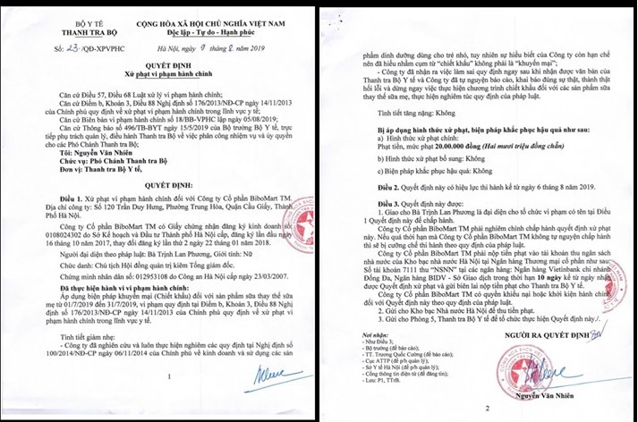 Tại quyết định số 23/QĐ-XPVPHC ngày 9.8 của Thanh tra Bộ Y tế có nêu rõ mức xử phạt đối với Công ty CP Bibomart TM là 20.000.000 đồng. Số tiền nộp phạt vào Kho bạc Nhà nước trong thời hạn 10 ngày (kể từ ngày 6.8 – ngày quyết định có hiệu lực).