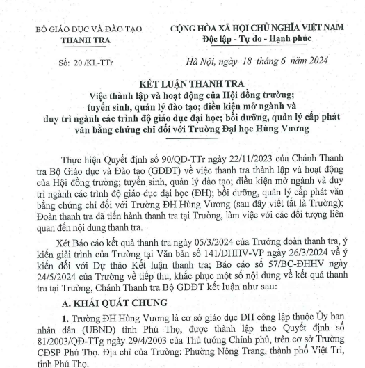 Kết luận thanh tra việc thành lập và hoạt động của Hội đồng Trường; tuyển sinh, quản lý đào tạo; điều kiện mở ngành và duy trì ngành các trình độ giáo dục đại học; bồi dưỡng, quản lý cấp phát văn bằng chứng chỉ đối với Trường Đại học Hùng Vương
