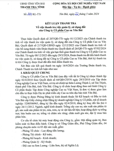 Kết luận thanh tra số 44/KL-TTr ngày 22/5/2024 về việc thanh tra việc quản lý, sử dụng đất của Công ty Cổ phần Cao su Yên Bái