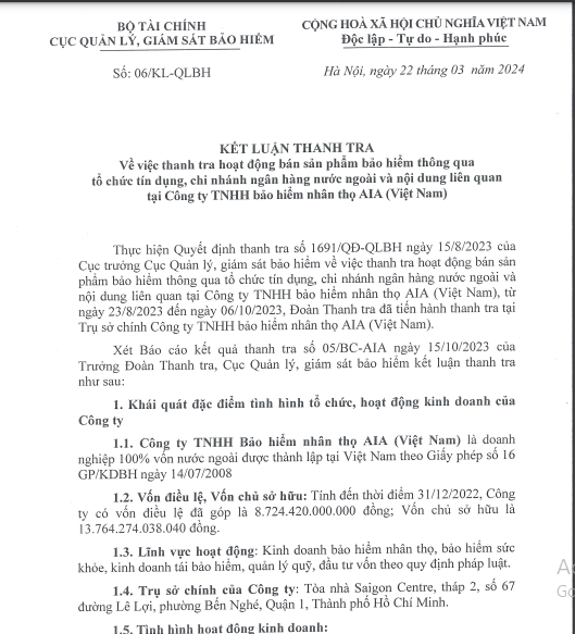 Kết luận thanh tra tại AIA đã nêu rõ các tồn tại, vi phạm của công ty trong hoạt động bán sản phẩm bảo hiểm thông qua tổ chức tín dụng, chi nhánh ngân hàng nước ngoài.