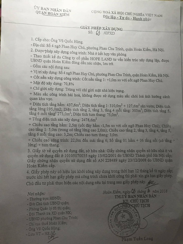 Theo phản ánh của người dân, tại công trình số 4 ngõ Phan Huy Chú, đường Phan Huy Chú được cấp Giấy phép xây dựng số 63/GPXD do UBND quận Hoàn Kiếm cấp, được phép xây dựng 1 tầng hầm, 6 tầng nổi (có tầng lửng) và tum thang.