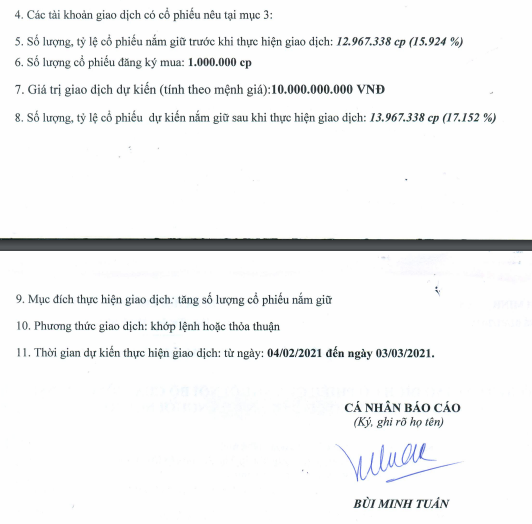 Nếu giao dịch thành công, ông Tuấn sẽ nâng sở hữu tại Transimex từ 12,97 triệu cổ phiếu, tỷ lệ 15,924% lên 13,97 triệu cổ phiếu, tỷ lệ 17,152%. Phương thức giao dịch là khớp lệnh hoặc thỏa thuận, dự kiến từ ngày 4/2 đến ngày 3/3/2021.